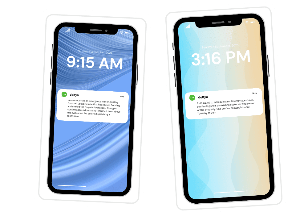 We’re not just a voice taking messages. dolfyn AI Agents are trained to follow your script, book jobs directly in your system, and integrate with your tools. Think of us as an extension of your team that's working for you 24/7.